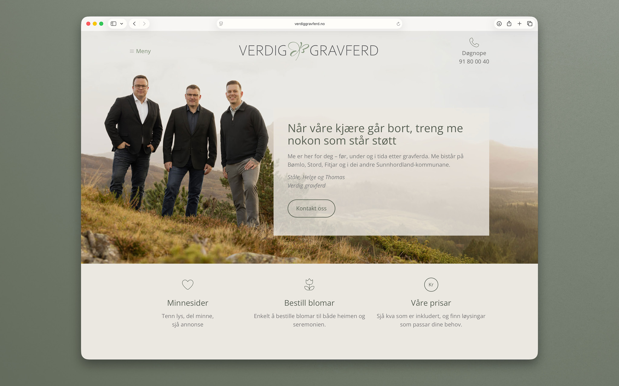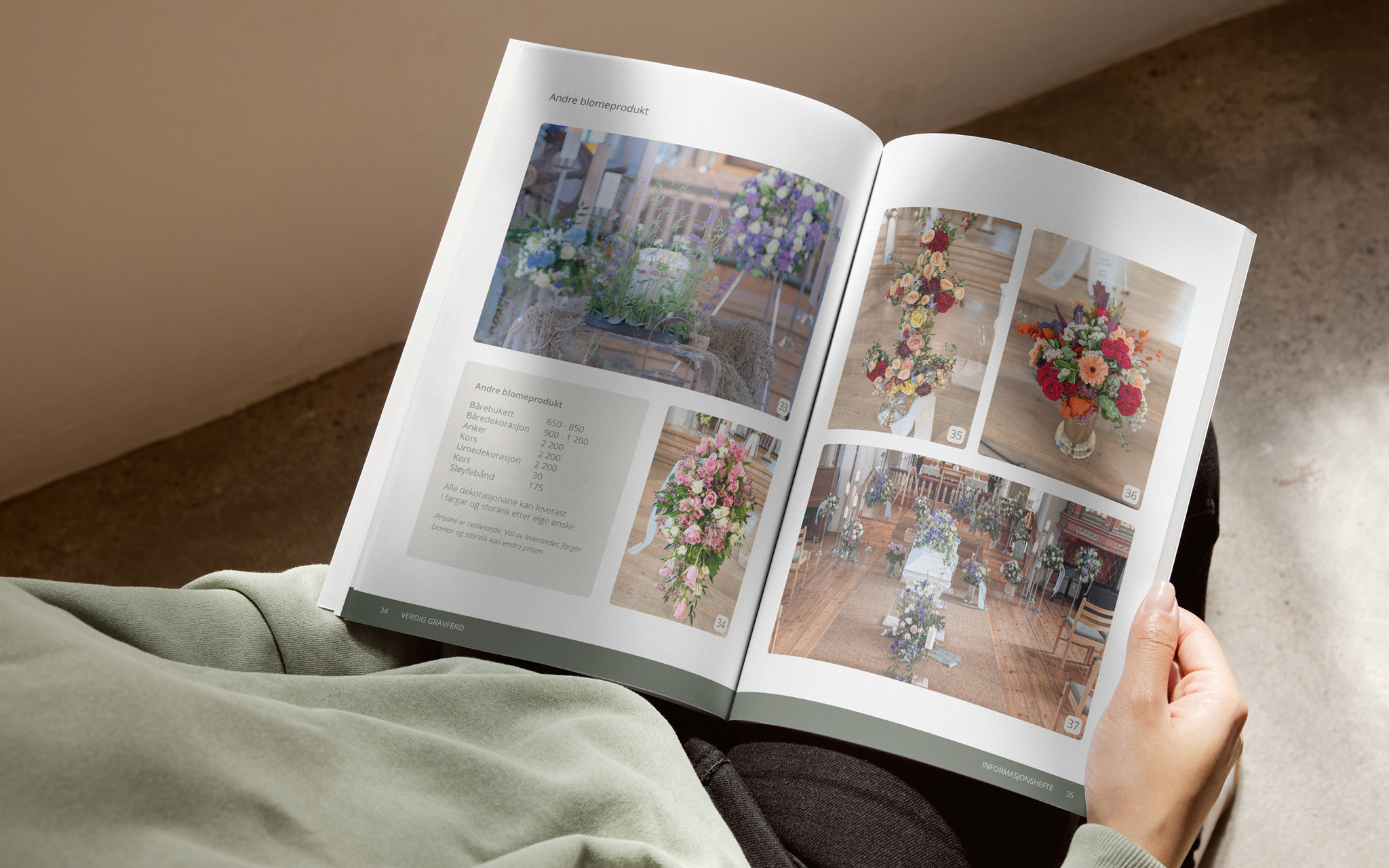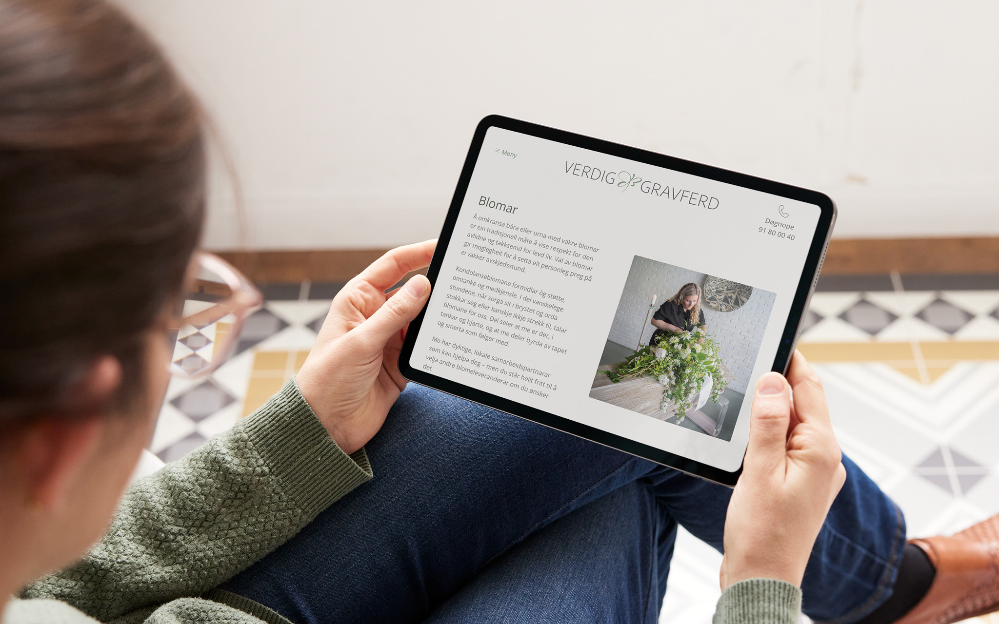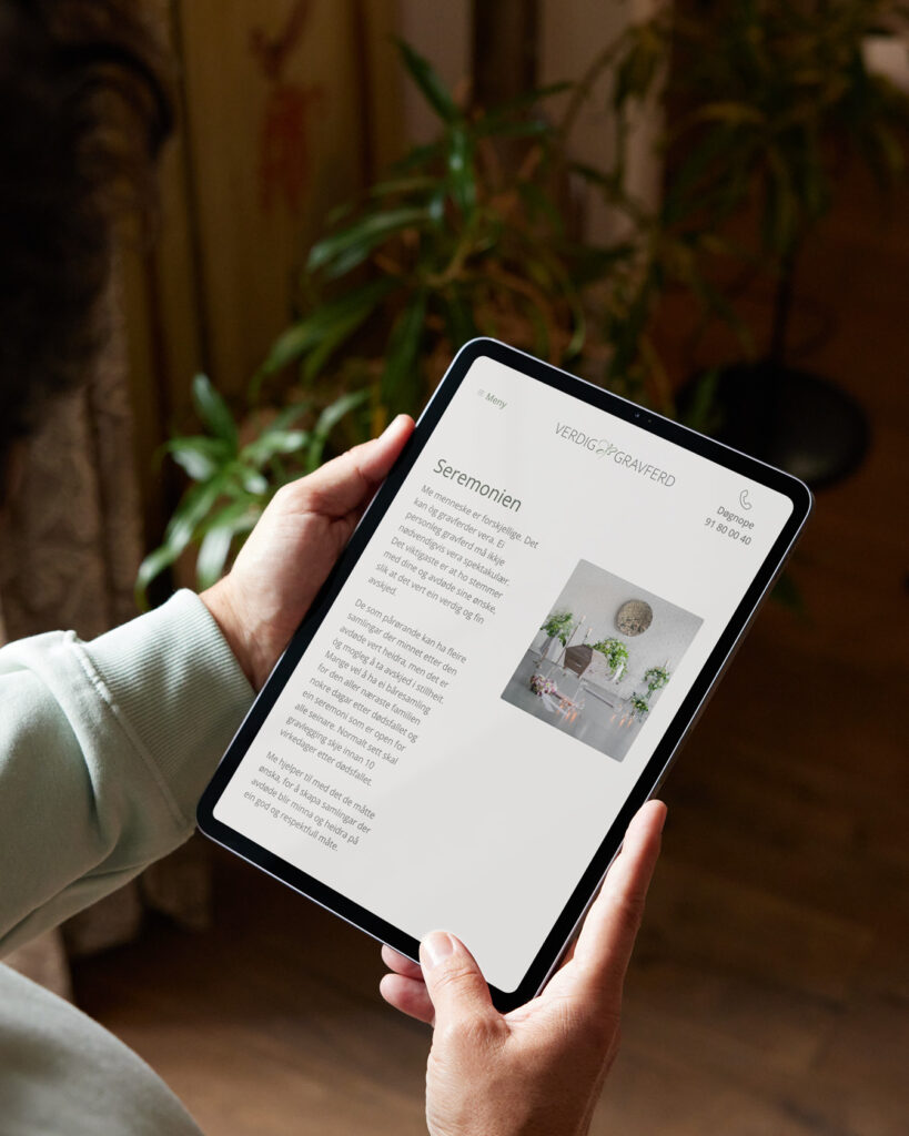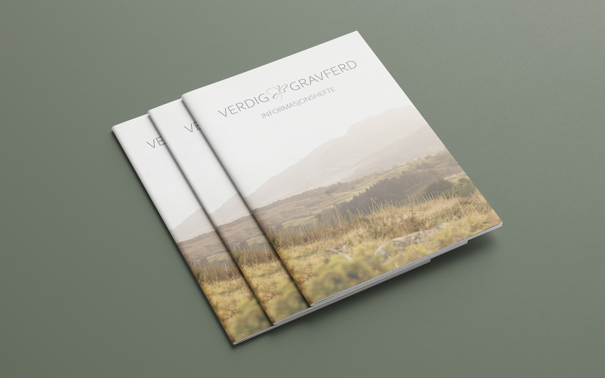Den digitale flaten er supplert med en informasjonsbrosjyre i samme visuelle univers. Slik møter pårørende et sammenhengende uttrykk – fra første nettsøk til det personlige møtet med Verdig Gravferd.